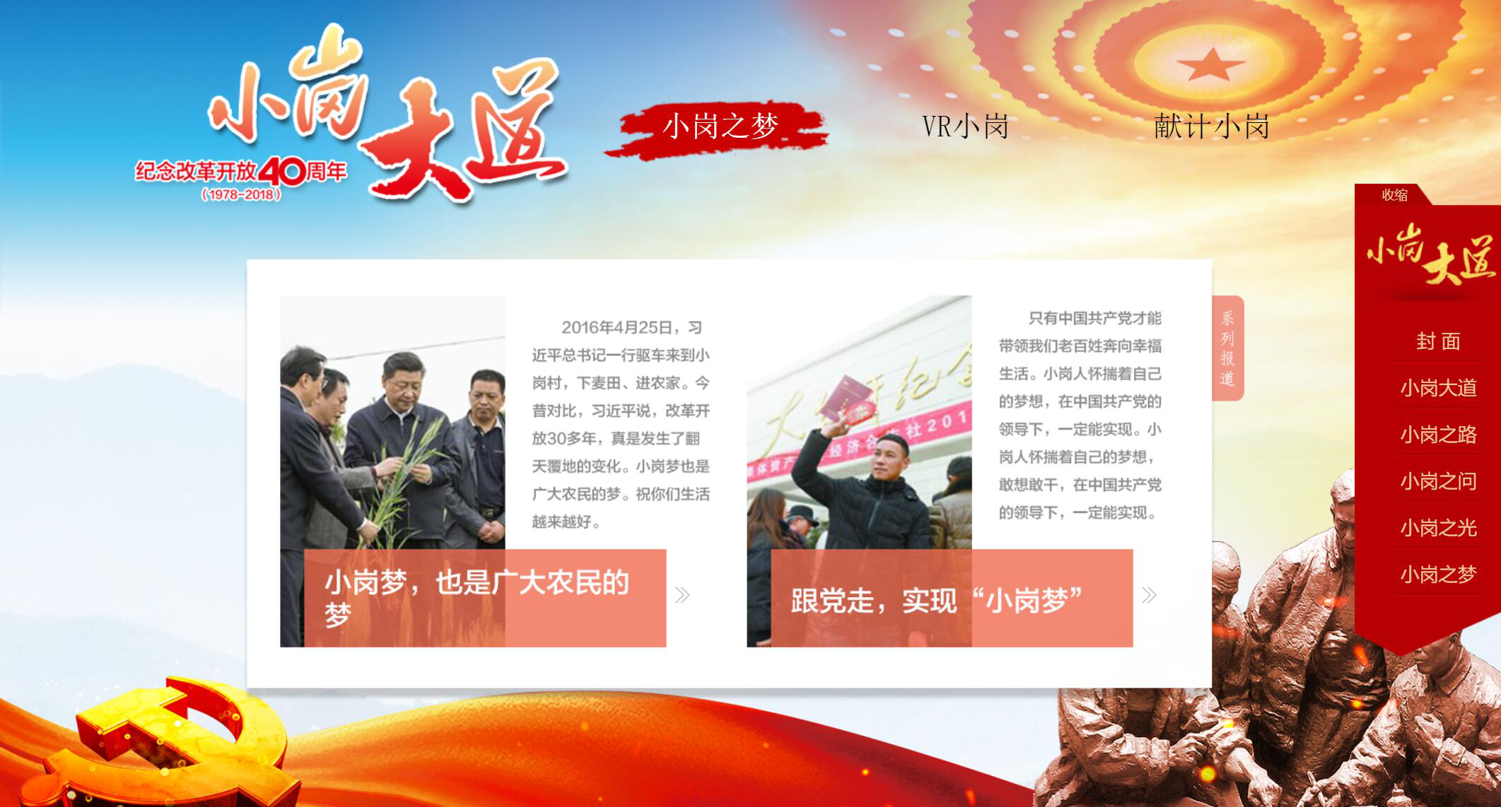 中安在線網站制作推出的《小崗大道》大型可視化網絡專題獲中國新聞獎三等獎(作者:宋藝、胡高榮、唐娜、王浩、李曉露、付剛,編輯:陳鵬運、毛書兵)。專題開設“小崗大道”“小崗之路”“小崗之問”“小崗之光”和“小崗之夢”五大版塊,通過圖文集納,視頻展播,交流互動等方式,把“小人物”“小事件”“小變化”串聯起來,以畫卷展覽的呈現方式講述小崗的“昨天”今天”和“明天”。展現40年來小崗人在黨和政府的關心領導下,一步步從貧窮落后走向幸福美滿康莊大道的美好畫卷。專題運用文字、圖片、動畫、視頻、圖表、VR、H5等多媒體敘事方式,全景展現小崗村的改革之路。
